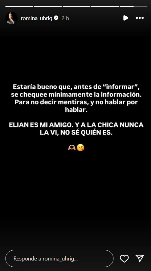 El rumor se viralizó rápidamente en redes sociales y medios de comunicación. Sin embargo, Romina Uhrig no tardó en responder. A través de una historia de Instagram, la ex participante de Gran Hermano desmintió las acusaciones de manera categórica. Con un tono de fastidio, declaró que L-Gante es su amigo, pero que a la mujer que la acusó “nunca la vi, no sé quién es”. Con su mensaje, Romina no solo negó cualquier relación amorosa o sexual con el cantante, sino que también hizo un llamado a los medios de comunicación a verificar la información antes de publicarla, una crítica directa a la falta de rigor periodístico que, a su entender, alimenta este tipo de escándalos.