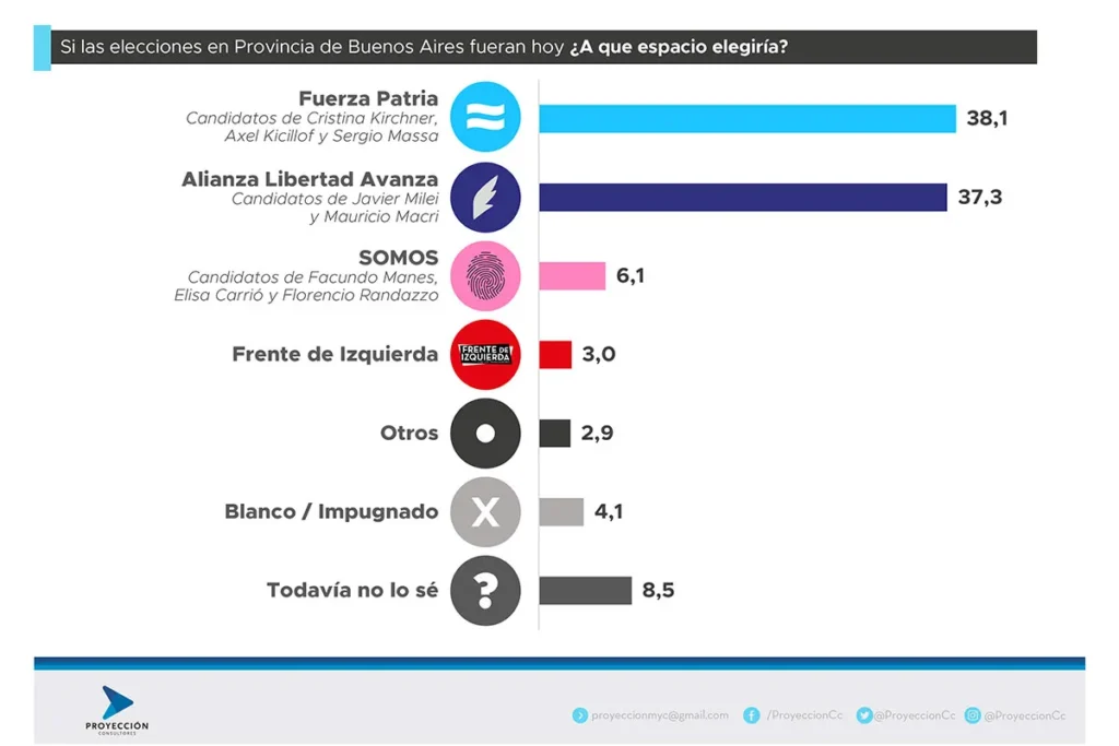 A poco menos de un mes para que los bonaerenses acudan a las urnas, una encuesta de la consultora Proyección ha arrojado resultados que confirman una competencia de final abierto. El estudio, realizado entre el 24 de julio y el 5 de agosto, sobre una muestra de más de 6.000 encuestados, muestra una paridad absoluta entre las dos principales coaliciones. La Alianza Libertad Avanza, con un 37,3 por ciento de la intención de voto, se encuentra a solo 0,8 puntos de Fuerza Patria, que lidera el sondeo con un 38,1 por ciento. Este margen de error, en el contexto de una elección que se definirá en las urnas, es la prueba más clara de que el resultado sigue siendo una incógnita.