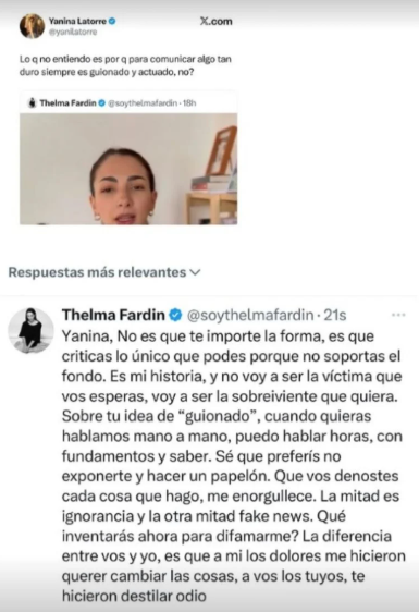 La respuesta de Thelma Fardin no se hizo esperar. En una contundente publicación, la actriz acusó a Latorre de priorizar la forma por sobre el fondo de su lucha, y la instó a debatir el tema en un cara a cara. “La diferencia entre vos y yo, es que a mí los dolores me hicieron querer cambiar las cosas, a vos los tuyos, te hicieron destilar odio”, afirmó, aludiendo a la forma en la que cada una de ellas gestiona sus propias experiencias de vida.