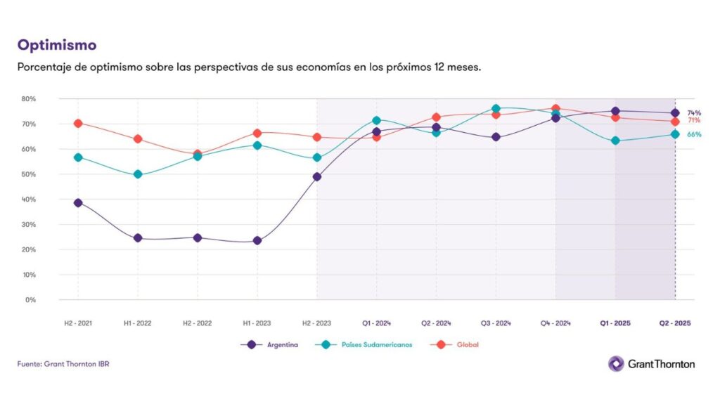En un contexto global de incertidumbre y desaceleración, las empresas del mercado medio en Argentina demuestran una notable resiliencia, manteniendo un nivel de optimismo que supera los promedios regionales y mundiales. Según el International Business Report (IBR) del segundo trimestre de 2025 de Grant Thornton, el 74% de los empresarios locales se muestra optimista sobre el futuro de sus negocios, una cifra significativamente superior al 66% de Sudamérica y al 71% global.