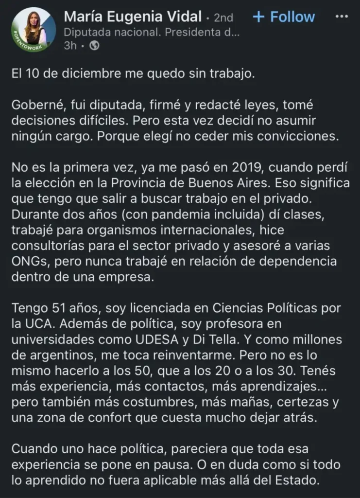 Afuera de las listas, la diputada María Eugenia Vidal sorprendió con un posteo en LinkedIn en el que anuncia su búsqueda de trabajo. El mensaje, sin embargo, es una crítica a la alianza entre el PRO y La Libertad Avanza, un llamado a la coherencia y una reflexión sobre el futuro.