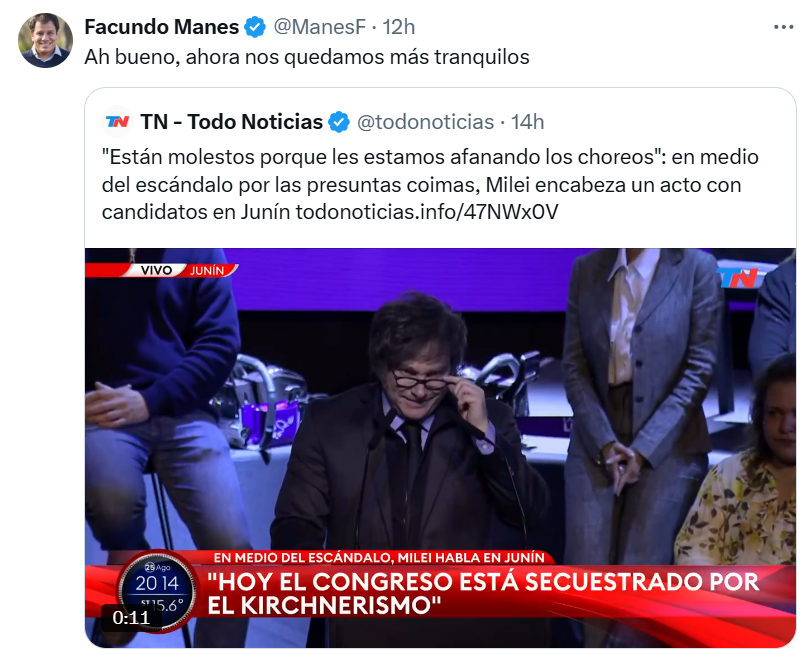 El mandatario convocó a sus seguidores a votar en masa en las elecciones provinciales del 7 de septiembre, señalando que será “el último clavo en el cajón” del kirchnerismo. Sin embargo, advirtió sobre posibles fraudes electorales ligados a sistemas de votación tradicionales, en contraste con la Boleta Única Electrónica implementada para los comicios nacionales.