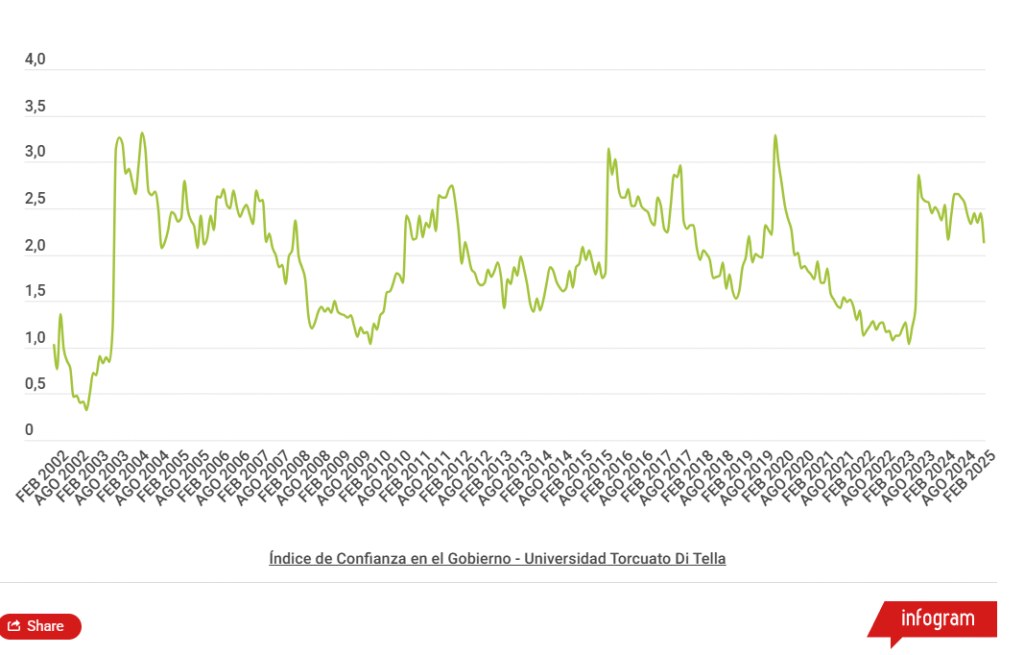 No obstante, a pesar de la retórica polarizadora y combativa, una reciente encuesta publicada por la Universidad Torcuato Di Tella, realizada entre el 1 y el 14 de agosto de 2025, muestra una caída significativa en la confianza ciudadana hacia el gobierno. El Índice de Confianza en el Gobierno (ICG) cayó un 13,6% respecto al mes anterior, ubicándose en 2,12 puntos sobre 5, el nivel más bajo desde la asunción de Milei.