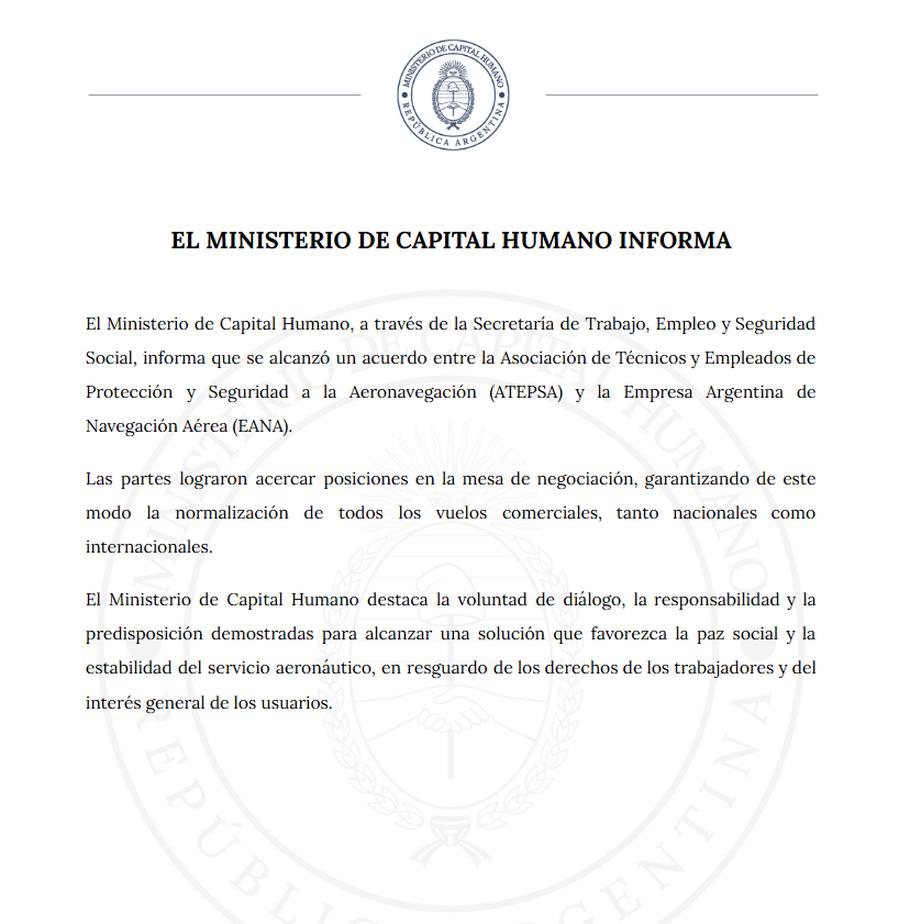 El Ministerio de Capital Humano y el gremio de controladores aéreos llegaron a un acuerdo que suspendió el paro programado para el jueves y sábado 28, garantizando la normalidad en los vuelos.