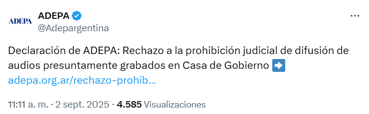 La prohibición judicial generó un rechazo unánime de organizaciones vinculadas al periodismo, como la Asociación de Entidades Periodísticas Argentinas (ADEPA) y la Federación de Periodistas Argentinos (FOPEA), que calificaron la acción como censura previa y un atentado a la libertad de prensa. Destacaron además que la ley argentina establece que la responsabilidad por la difusión de información debe evaluarse tras la publicación, no impedirse anticipadamente, y advirtieron sobre el peligroso precedente que implica esta resolución para la democracia.