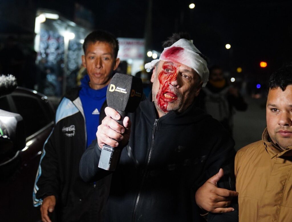 Se confirmó que el cronista, Cristian Mercatante, fue herido de un botellazo, de manera repentina, cuando estaba haciendo notas a unos encapuchados presentes en el acto.