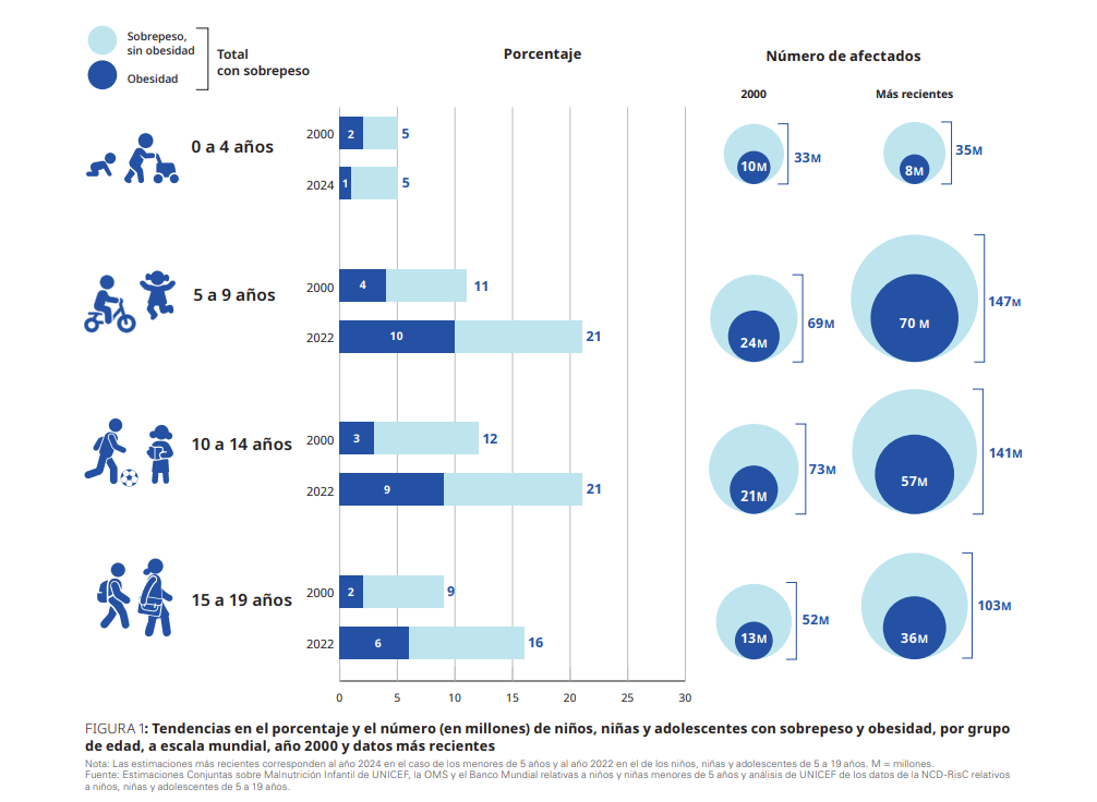El informe “Alimentando el negocio. Cómo los entornos alimentarios ponen en peligro el bienestar de la infancia”, elaborado por UNICEF en 2025, revela que la obesidad se ha convertido en la principal forma de malnutrición en la infancia y adolescencia a nivel mundial.