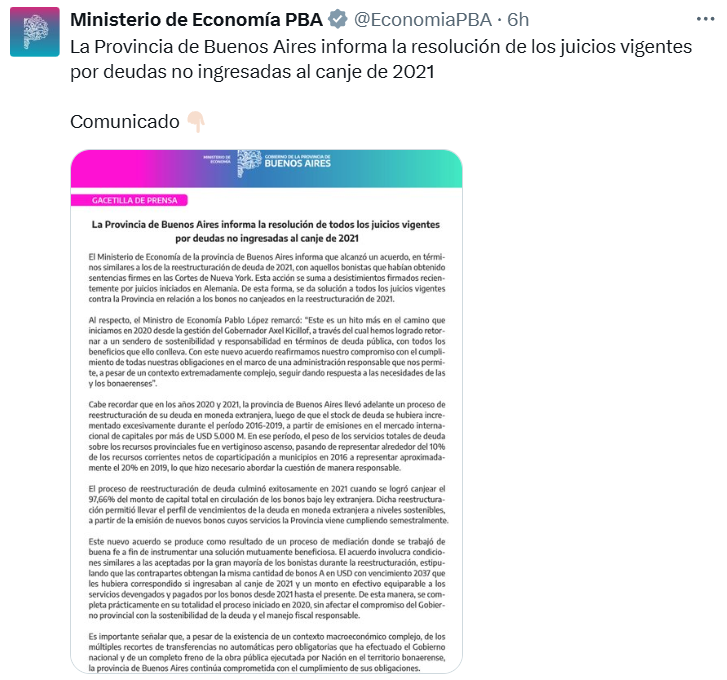 La Provincia de Buenos Aires informó oficialmente la resolución de todos los juicios vigentes por bonos que no ingresaron al canje de deuda realizado en 2021. El acuerdo, anunciado por el Ministerio de Economía, incluyó a bonistas con sentencias firmes en las cortes de Nueva York y a quienes desistieron recientes litigios en Alemania. Las condiciones son similares a las pactadas en la reestructuración de deuda de 2021.