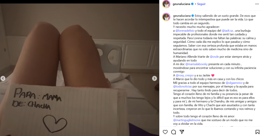 La periodista Luciana Geuna fue internada en un hospital porteño tras un episodio inesperado de salud. Agradeció al equipo médico, a su familia y colegas por el apoyo durante su recuperación, y compartió un mensaje alentador desde el Instituto Argentino de Diagnóstico y Tratamiento.