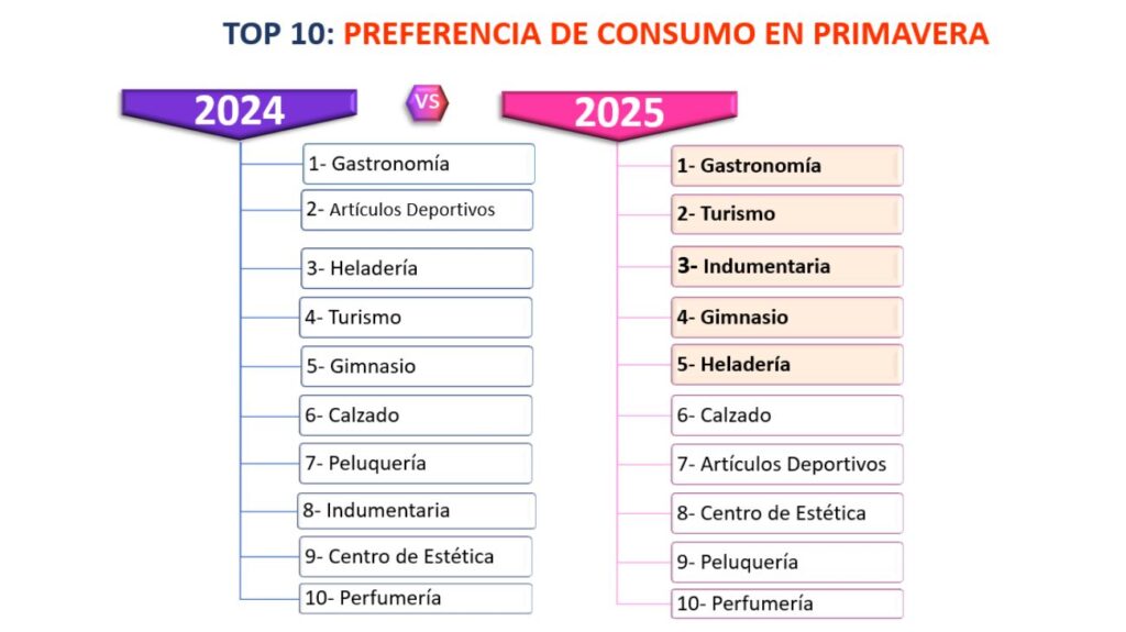 El estudio, basado en 3.023 casos, ubica a la Gastronomía, el Turismo, la Indumentaria, las Heladerías y el Gimnasio como los rubros preferidos. A diferencia del año anterior, el turismo escala posiciones, consolidándose como una de las principales aspiraciones de los consumidores.