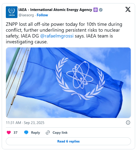 La pérdida de energía eléctrica fue la décima vez durante el conflicto entre Rusia y Ucrania, indicaron el martes desde el Organismo Internacional de Energía Atómica (OIEA) en la red social X, añadiendo que su equipo está investigando la causa del incidente.