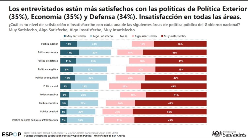 El informe destaca una marcada diferencia en la evaluación de la gestión. Mientras áreas como Política Exterior (35%), Economía (35%) y Defensa (34%) obtienen los mayores niveles de satisfacción entre los encuestados, las políticas de impacto directo en la vida diaria generan un rechazo masivo.