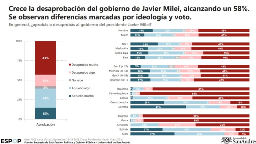 Los datos surgen de la Encuesta de Satisfacción Política y Opinión Pública de la Universidad de San Andrés, correspondiente a septiembre, donde se profundiza la tendencia negativa hacia la gestión de Javier Milei.