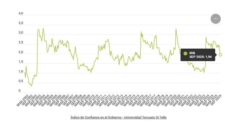 La administración de Javier Milei enfrenta su mayor crisis de confianza desde que asumió la presidencia en diciembre de 2023, según el último Índice de Confianza en el Gobierno (ICG) elaborado por la Universidad Torcuato Di Tella. La medición arrojó en septiembre un valor de tan solo 1,94 puntos en una escala de 0 a 5, marcando un descenso mensual del 8,2% y una caída interanual del 10%.