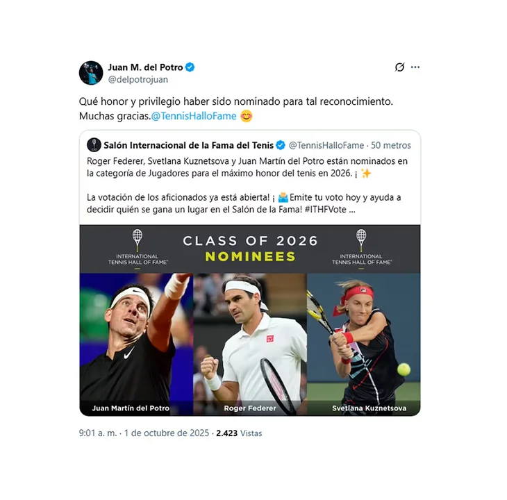 En caso de ser elegido, Del Potro se convertirá en el tercer argentino en ingresar al Salón de la Fama, después de Guillermo Vilas en 1991 y Gabriela Sabatini en 2006.