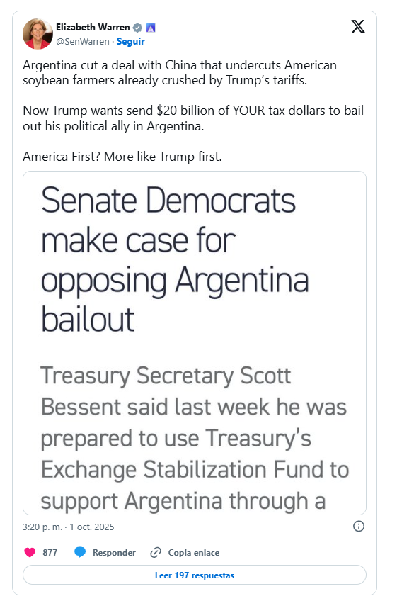 “Argentina llegó a un acuerdo con China que perjudica a los productores de soja estadounidenses ya aplastados por los aranceles de Trump”, escribió Warren en la red social X. La senadora fue más allá, al señalar que Trump planea “enviar 20 mil millones de dólares de SUS impuestos para rescatar a su aliado político en Argentina. ¿América Primero? Más bien, Trump Primero“. En una columna publicada por El País, se analizó cómo la ofensiva de Trump contra el comercio mundial estaba teniendo un “efecto bumerán” en su propia base de votantes.