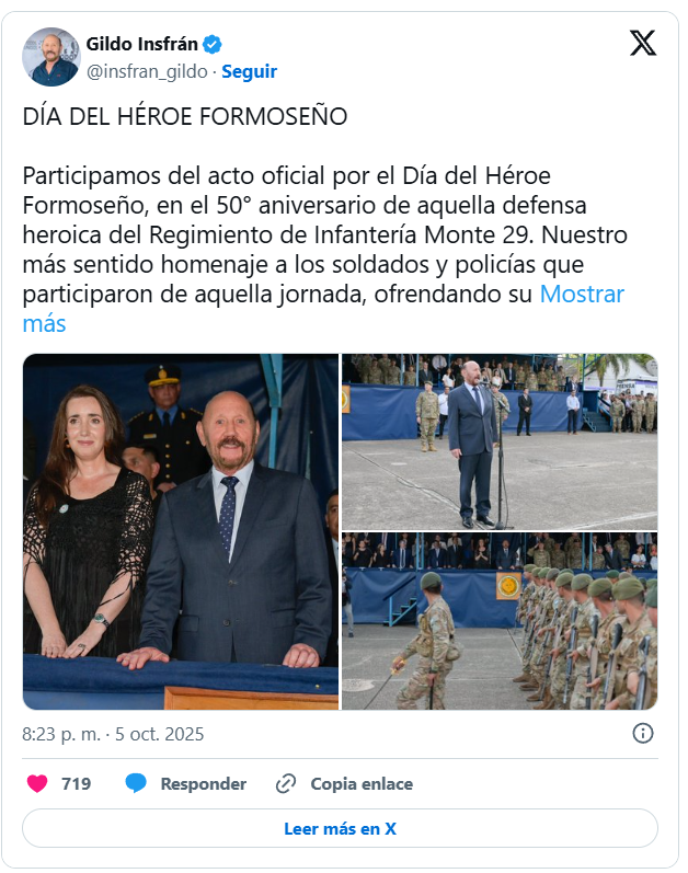 La vicepresidenta Victoria Villarruel compartió un acto oficial con el gobernador peronista Gildo Insfrán en Formosa. El encuentro, en el Día del Héroe Formoseño, fue interpretado como una señal política de distensión y respeto institucional hacia las provincias.