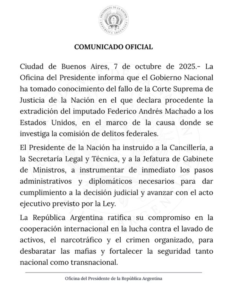 Posteriormente, el presidente Javier Milei instruyó a la Cancillería, a la Secretaría Legal y Técnica y a la Jefatura de Gabinete para realizar los pasos administrativos y diplomáticos necesarios para ejecutar la extradición.