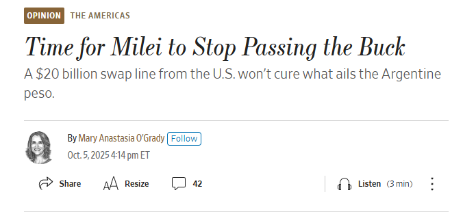 El artículo destaca que la economía argentina sigue en crisis a pesar de la línea de swap por USD 20.000 millones con EE.UU. y advierte que el peso sigue debilitándose. La periodista Mary Anastasia O’Grady señala que la salida adecuada es avanzar hacia la dolarización, ante la presión política y la inestabilidad creciente.
