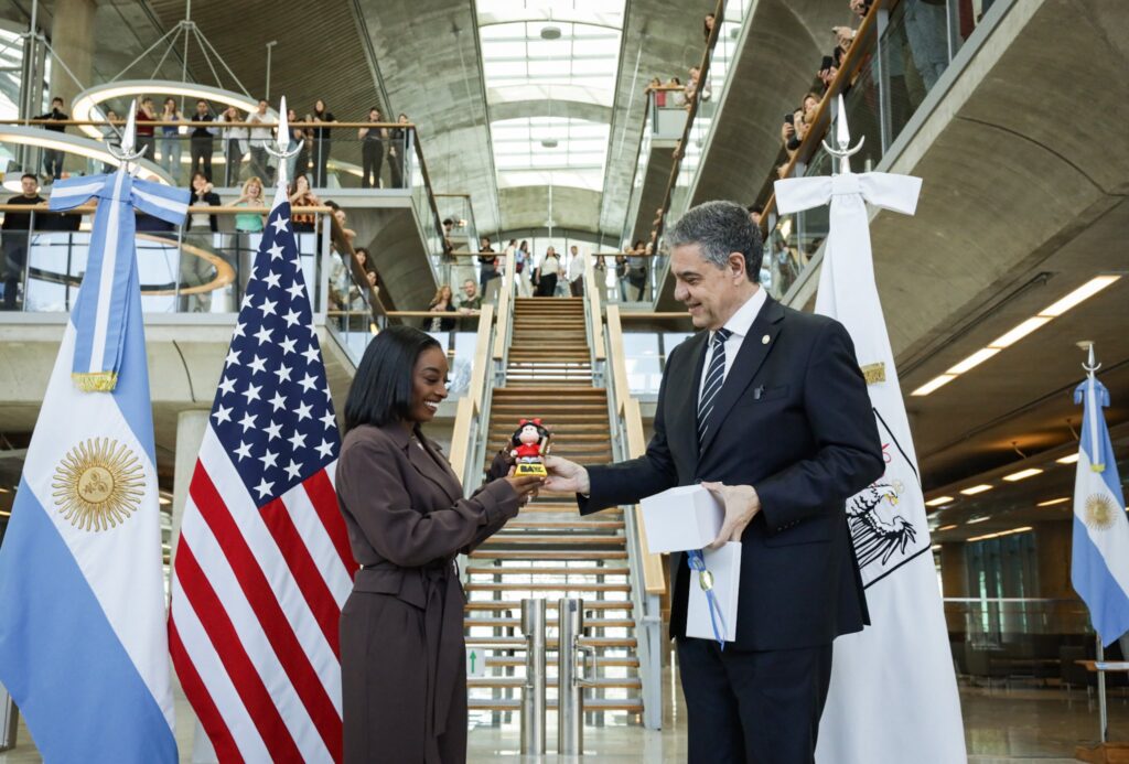 Más allá de los honores, la agenda de la multicampeona incluye actividades prácticas. Este jueves, Biles encabezará una clínica de gimnasia artística junto a su entrenador, Laurent Landi, en el Estadio Mary Terán de Weiss, ubicado en el Parque Roca.