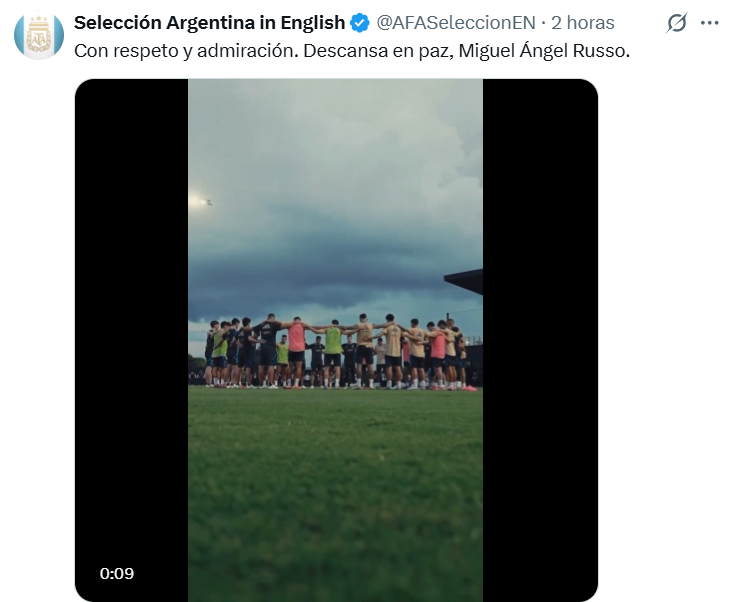 La Selección argentina realizó un minuto de silencio en honor a Miguel Ángel Russo, quien falleció este miércoles a sus 69 años mientras se encontraba internado en su domicilio con pronóstico reservado, pero con un grave estado de salud.