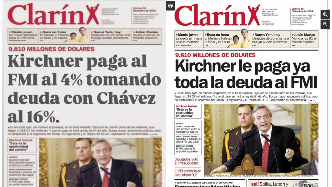 La tapa original de Clarín de diciembre de 2005, que se viralizó rápidamente para desmentir al Presidente, titulaba en realidad: “Kirchner le paga ya toda la deuda al FMI”.
