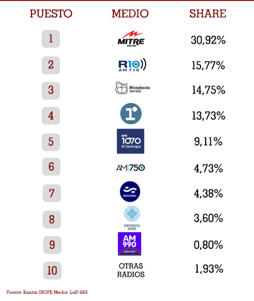 Según la última medición de audiencia trimestral elaborada por Kantar Ibope Media, Radio Mitre reafirmó su liderazgo en el segmento AM durante el período julio-septiembre de 2025, alcanzando un share del 30,92%. En FM, La 100 mantuvo su posición dominante con un 21,36% de share, consolidándose como la emisora más escuchada.