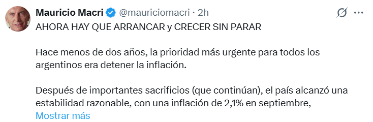 Mauricio Macri señaló que la inflación alcanzó 2,1% en septiembre, un dato inédito en los últimos años. Contrastó esta cifra con la inflación anual de 211,4% que dejó la gestión de Alberto Fernández, como un logro significativo producto de sacrificios recientes.