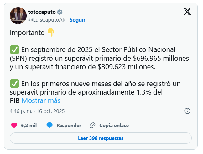 El ministro de Economía, Luis Caputo, reivindicó la política de austeridad fiscal en sus redes sociales. El titular del Palacio de Hacienda aseguró que “frente a los intentos de parte del arco político de romper el equilibrio fiscal, el Gobierno continuará garantizando el orden en las cuentas públicas”. El superávit financiero de $309.623 millones contrasta con el déficit de casi $2.1 billones que se había registrado en septiembre de 2023, en el último tramo del gobierno de Alberto Fernández.