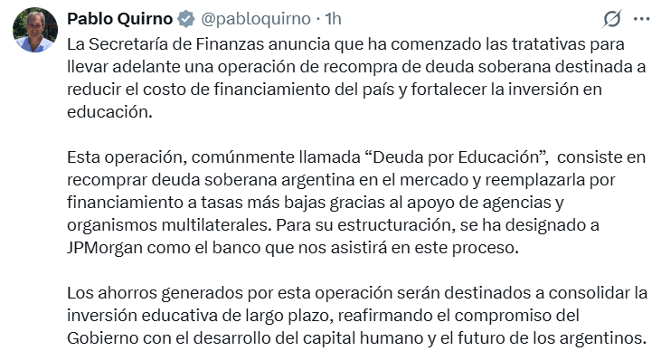 El secretario de Finanzas, Pablo Quirno, confirmó el inicio de tratativas para una operación denominada “Deuda por Educación”, que consiste en recomprar bonos en el mercado y reemplazarlos por deuda a menor tasa, con los ahorros destinados a fortalecer la inversión en educación pública.