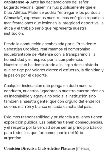 Sin embargo, en Platense rechazaron de inmediato las declaraciones y emitieron un comunicado oficial. “Ante las declaraciones de Edgardo Medina, quien insinuó públicamente que nuestro club podría ‘entregarle los puntos a Gimnasia’, expresamos nuestro más enérgico repudio a manifestaciones que afectan la integridad deportiva y el trabajo serio de nuestra institución”, indicaron.