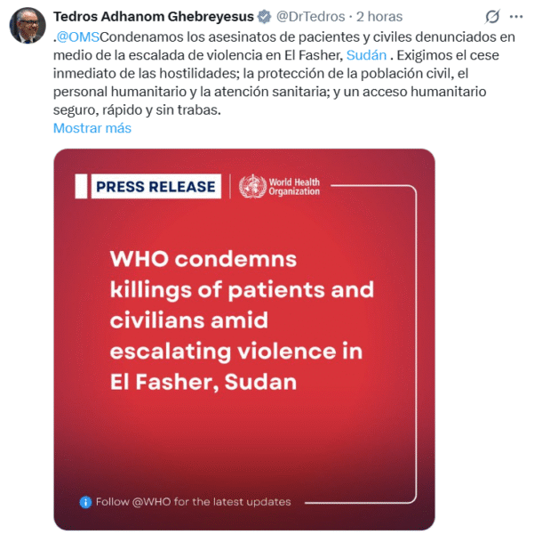 El director general de la OMS, Tedros Adhanom Ghebreyesus, difundió en su cuenta oficial de X que la agencia está “horrorizada y profundamente conmocionada” por esta masacre, ocurrida tras otros ataques previos y detenciones de personal sanitario.