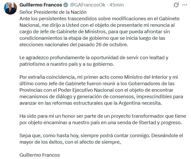 Francos expresó su agradecimiento por haber formado parte de un proyecto que busca “encaminar al país en una senda de libertad y progreso”, sin ofrecer detalles sobre su futuro político.
