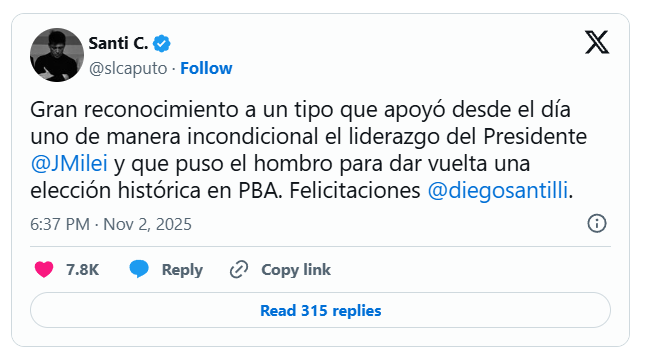 “Gran reconocimiento a un tipo que apoyó desde el día uno el liderazgo de Milei”, manifestó en sus redes.