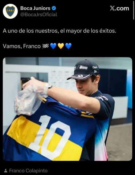 Boca, equipo del que Colapinto es hincha fanático, publicó un posteo en sus redes sociales con una foto del argentino con la camiseta azul y oro con el siguiente mensaje: “Uno de los nuestros, el mayor de los éxitos. Vamos, Franco”.