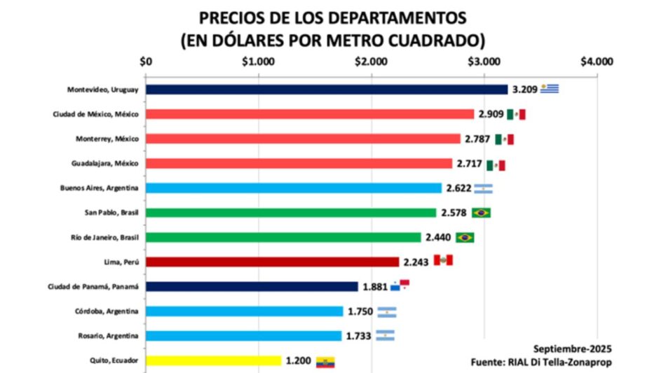 Un informe revela que el valor del metro cuadrado en la capital uruguaya supera los 3.200 dólares. Córdoba y Rosario, en cambio, se ubican entre las más accesibles de la región.