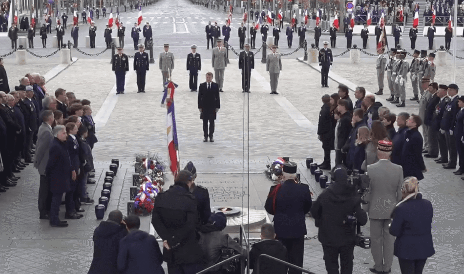 En París, el presidente Emmanuel Macron rindió homenaje a los caídos durante la ceremonia tradicional en la Tumba del Soldado Desconocido bajo el Arco de Triunfo, donde encendió la llama eterna en memoria de los franceses fallecidos.