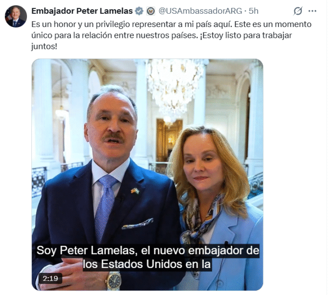 El diplomático publicó un video en sus redes sociales, acompañado por su esposa Stephanie Lamelas. Foto: USAmbassadorARG.