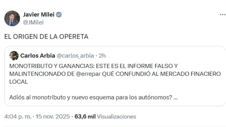 “El origen de la opereta” posteó el mandatario en su cuenta de X refiriendo a uno de Carlos Arbía, quien mencionaba al artículo de Errepar como “el informe falso y malintencionado que confundió al mercado financiero local”.