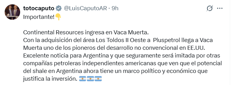 El Gobierno anunció el ingreso de Continental Resources, empresa estadounidense pionera en la explotación de hidrocarburos no convencionales, a la formación de Vaca Muerta. La firma adquirió a Pluspetrol el 90% del área Los Toldos II Oeste, un yacimiento en fase exploratoria donde se han perforado solo tres pozos.