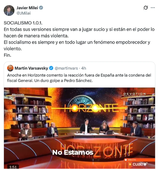 El presidente Javier Milei esta mañana reiteró sus críticas al socialismo y compartió un posteo contra el gobierno de España que encabeza Pedro Sánchez, con quien tuvo un altercado a principios de su mandato.