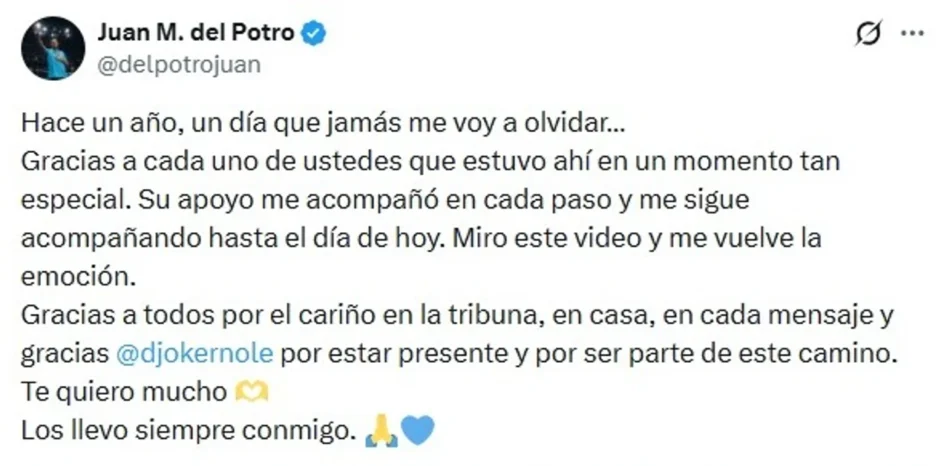 Este lunes, Del Potro recordó su despedida en redes con unas sentidas palabras: “Hace un año, un día que jamás me voy a olvidar… Gracias a cada uno de ustedes que estuvo ahí en un momento tan especial. Su apoyo me acompañó en cada paso y me sigue acompañando hasta el día de hoy. Miro este video y me vuelve la emoción. Gracias a todos por el cariño en la tribuna, en casa, en cada mensaje y gracias Nole (Djokovic) por estar presente y por ser parte de este camino. Te quiero mucho. Los llevo siempre conmigo”.