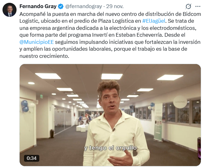 El intendente Fernando Gray participó en el acto de inauguración de las instalaciones de Bidcom Logistic, una empresa dedicada al sector logístico que se estableció en el Parque Industrial local.
