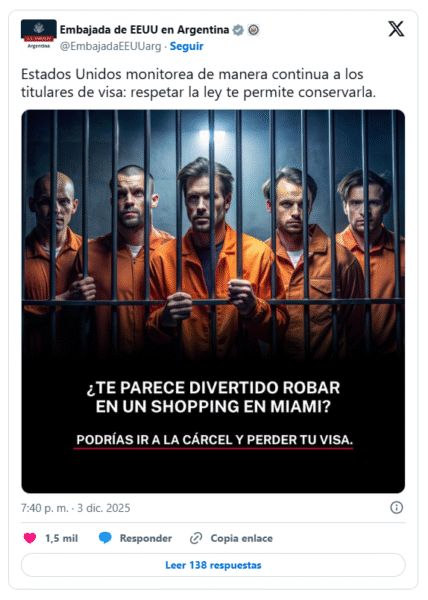 Cinco turistas argentinos fueron arrestados en Miami por robo organizado en un centro comercial. La Embajada de EE. UU. en Argentina emitió una dura advertencia en X, preguntando: “¿Te parece divertido?” y advirtiendo sobre cárcel y cancelación de visa, en medio de gestiones por la exención de visa.