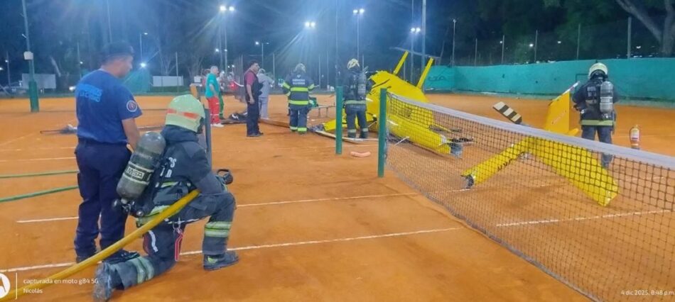 Efectivos policiales y de emergencia cortaron el perímetro para pericias. La máquina quedó volcada y destrozada en la cancha, frente a la Dirección Nacional de Emergencias Sanitarias. No se reportaron heridos en tierra ni daños a estructuras cercanas.
