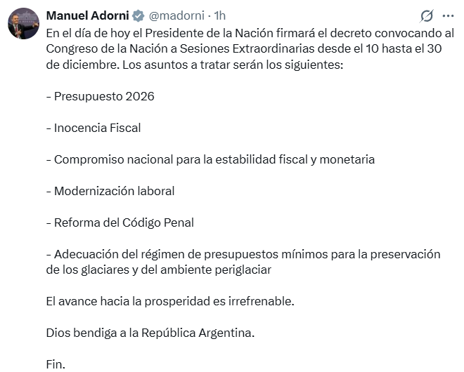 El presidente Javier Milei firmó el decreto que convoca al Congreso de la Nación a sesiones extraordinarias entre el 10 y el 30 de diciembre.