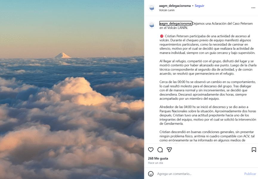 La delegación de San Martín de los Andes de la Asociación Argentina de Guías de Montaña (AAGM) emitió un comunicado para detallar los eventos previos a la internación de Christian Petersen.