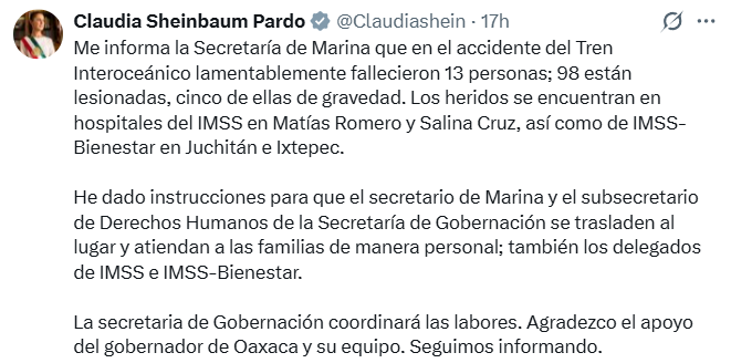La presidenta de México Claudia Sheinbaum se trasladó a la zona del desastre para supervisar las labores de asistencia y dialogar con los familiares de los fallecidos. La mandataria ordenó que el secretario de Marina y el subsecretario de Derechos Humanos coordinen la atención personal a los afectados. Asimismo, el gobierno federal suspendió el servicio ferroviario en el tramo afectado hasta garantizar que la infraestructura cumpla con los estándares de seguridad necesarios.