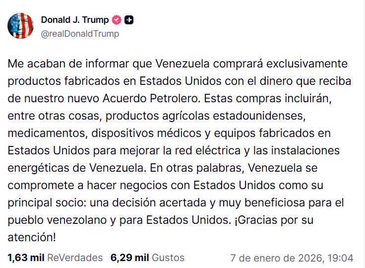 Donald Trump, presidente de Estados Unidos, publicó en su cuenta de Truth Social que Venezuela comprará únicamente productos estadounidenses con los fondos del acuerdo petrolero. El mensaje detalló adquisiciones de productos agrícolas, medicamentos, dispositivos médicos y equipos para mejorar la red eléctrica e instalaciones energéticas venezolanas.