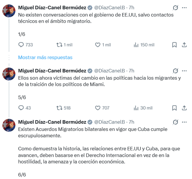 Díaz-Canel concluyó su mensaje responsabilizando a la política de Washington por el éxodo de sus ciudadanos, al afirmar que los migrantes son víctimas de leyes que fomentan salidas irregulares para luego ser utilizados por intereses políticos en Florida.